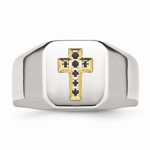 Impeccable in both style and design, this polished 316L stainless steel tapered ring features a raised 14k yellow gold accent cross set with genuine blue sapphires totaling 1/15 carat. The ring top measures approximately 13mm wide.