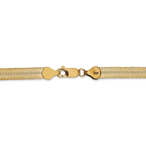 Express your bold attitude with a silky smooth chain that offers timeless appeal! This stunning 14k yellow gold chain features a classic herringbone pattern that measures 5.5mm in width and fastens with a secure, lobster-claw clasp. 24 inches in length.