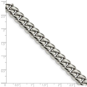 Ageless and classic, a domed curb chain is eye-catching and fashionable. The stainless steel solid links on this polished bracelet chain are approximately 10mm in width by 8.5-inches in length and closes with a fancy lobster clasp.