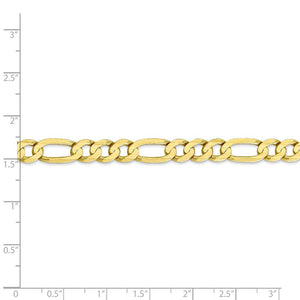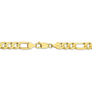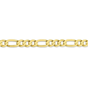 Known for its reoccurring three and one pattern, this stylish figaro chain with its solid link construction of 10k yellow gold features a bright, polished finish that adds lustrous appeal. It measure approximately 6.75mm wide by 9-inches long and fastens with a secure lobster-claw clasp.