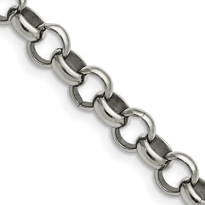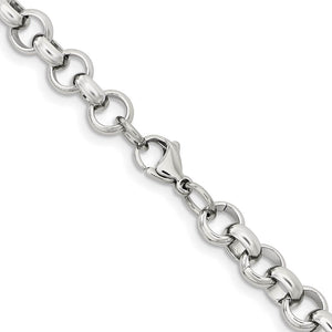 Known for its stunning broad links, this 8mm, 7.75 inch rolo chain featuring a high polished finish is fashioned from 316L stainless steel and closes with a fancy lobster clasp.