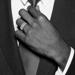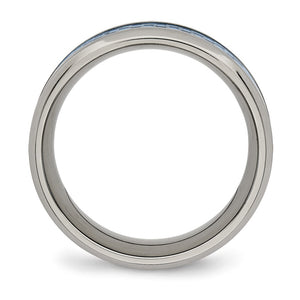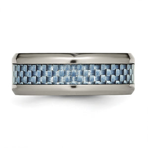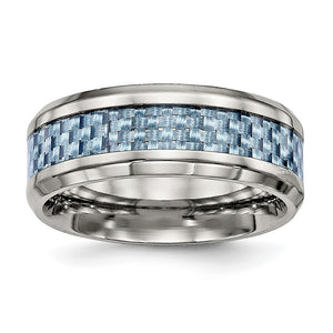A trendy modern design featuring a flat center inlaid with light blue carbon fiber and a polished beveled edges created from durable titanium. This comfort fit band is approximately 8mm in width and is suitable for engraving.