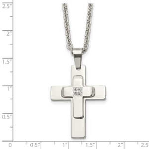 Celebrate and honor all special occasions with jewelry of religious significance! Our collection of spiritually inspired designs that show faith, hope and devotion are perfect for commemorating life's milestones. This stainless steel necklace features a polished layered cross pendant set with a 4 white cubic-zirconia stones that is approximately 25mm (1 inch) in width by 41mm (1 5/8 inch) in length, which includes the bail. It hangs on a 2.5mm width by 22-inch-long polished cable chain that closes with a fancy lobster clasp. Suitable for engraving on the back.