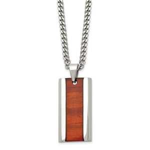 Earthy masculine style featuring a polished stainless steel rectangular design inlaid with red Koa wood and clear enamel. The pendant is approximately 22mm (7/8 inch) in width by 50mm (1 7/8 inch) in length, which includes the bail. It hangs on a 5mm width, 20-inch long stainless steel curb chain finished with a fancy lobster clasp. Please allow for natural variances in wood color and pattern. Suitable for engraving on the back.