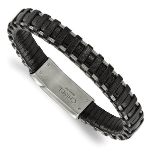 11.5mm Stainless Steel Brushed Cable & Black Leather Bracelet, 8.5 In