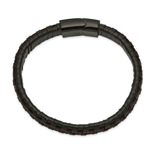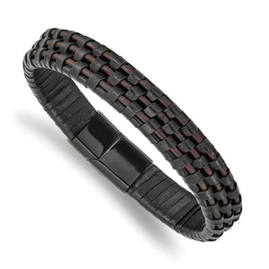 Rugged masculine style created from black-plated stainless steel and genuine black and brown leather. This 8.25 inch bracelet is approximately 12mm (7/16 inch) in width and closes with a magnetic clasp.