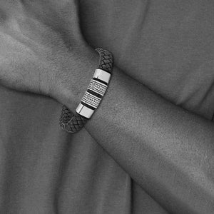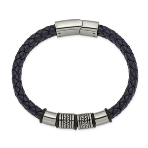 Change up your look with this braided blue leather and stainless steel bracelet featuring an antiqued and polished bead design with black silicone spacers. The woven band is approximately 11mm (7/16 inch) wide, the top width is approximately 14mm (9/16 inch) and length is 8.25 inches which includes the magnetic clasp.