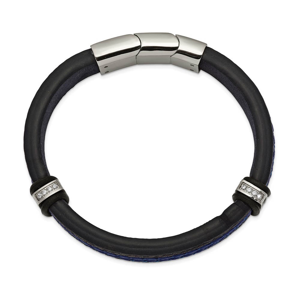 Stainless Steel, Black/Blue Leather & CZ Adjustable Bracelet, 8 Inch