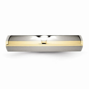 • A simple, curving band of titanium combined with a single, 14k yellow gold inlay stripe compliments any outfit. This stunning, unisex ring measures 5mm wide and features a brilliant, polished finish and a standard fit shank. Because it is also hypoallergenic, it is perfect for everyday wear. Available in whole and half sizes 6-13. Suitable for engraving.