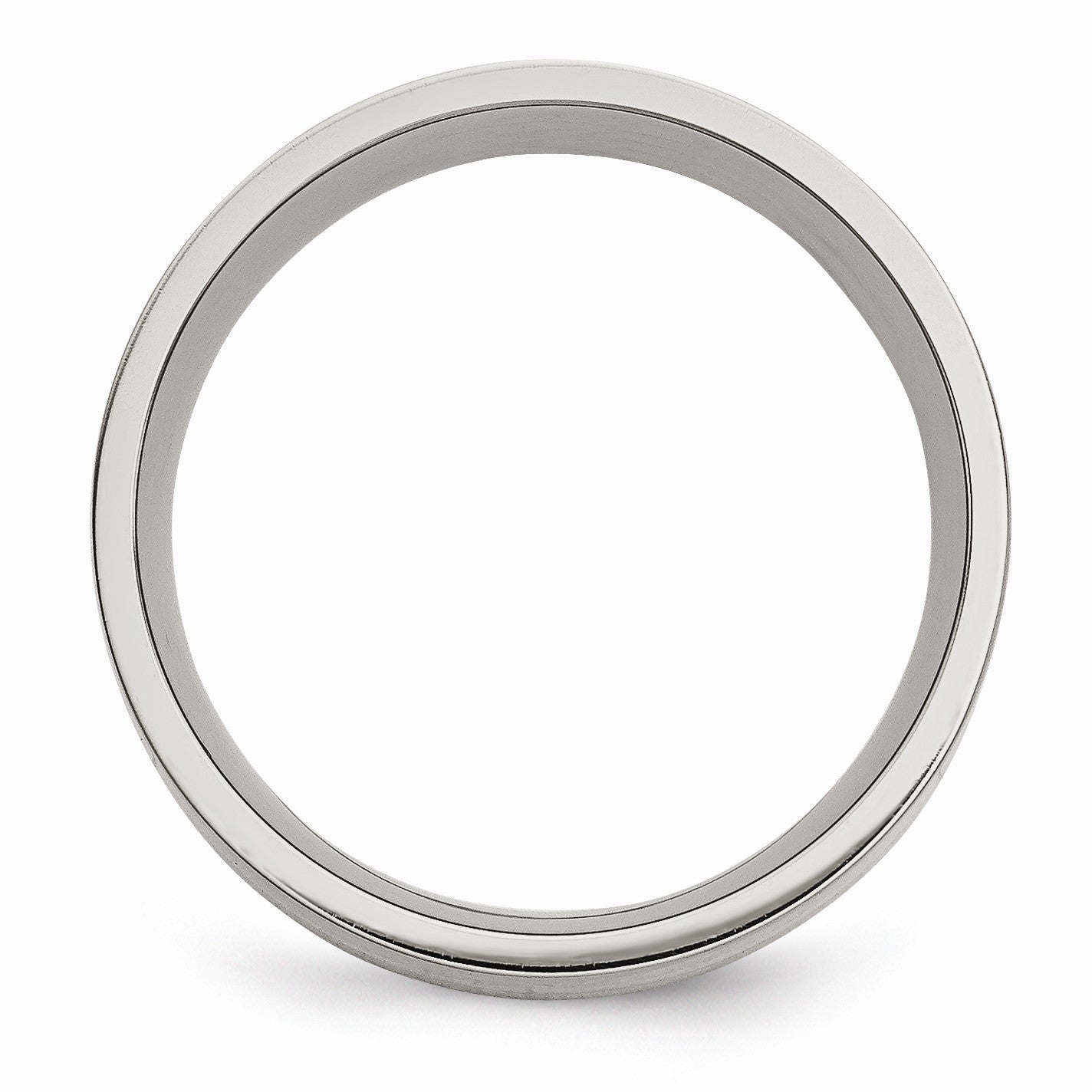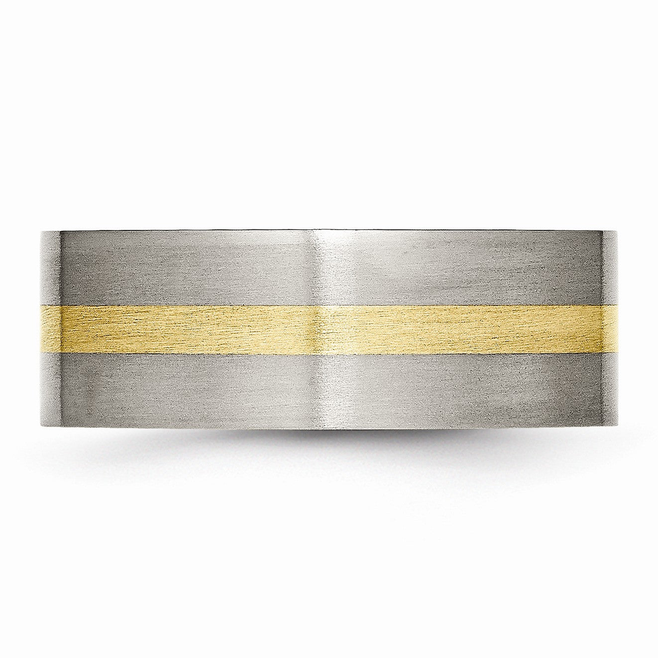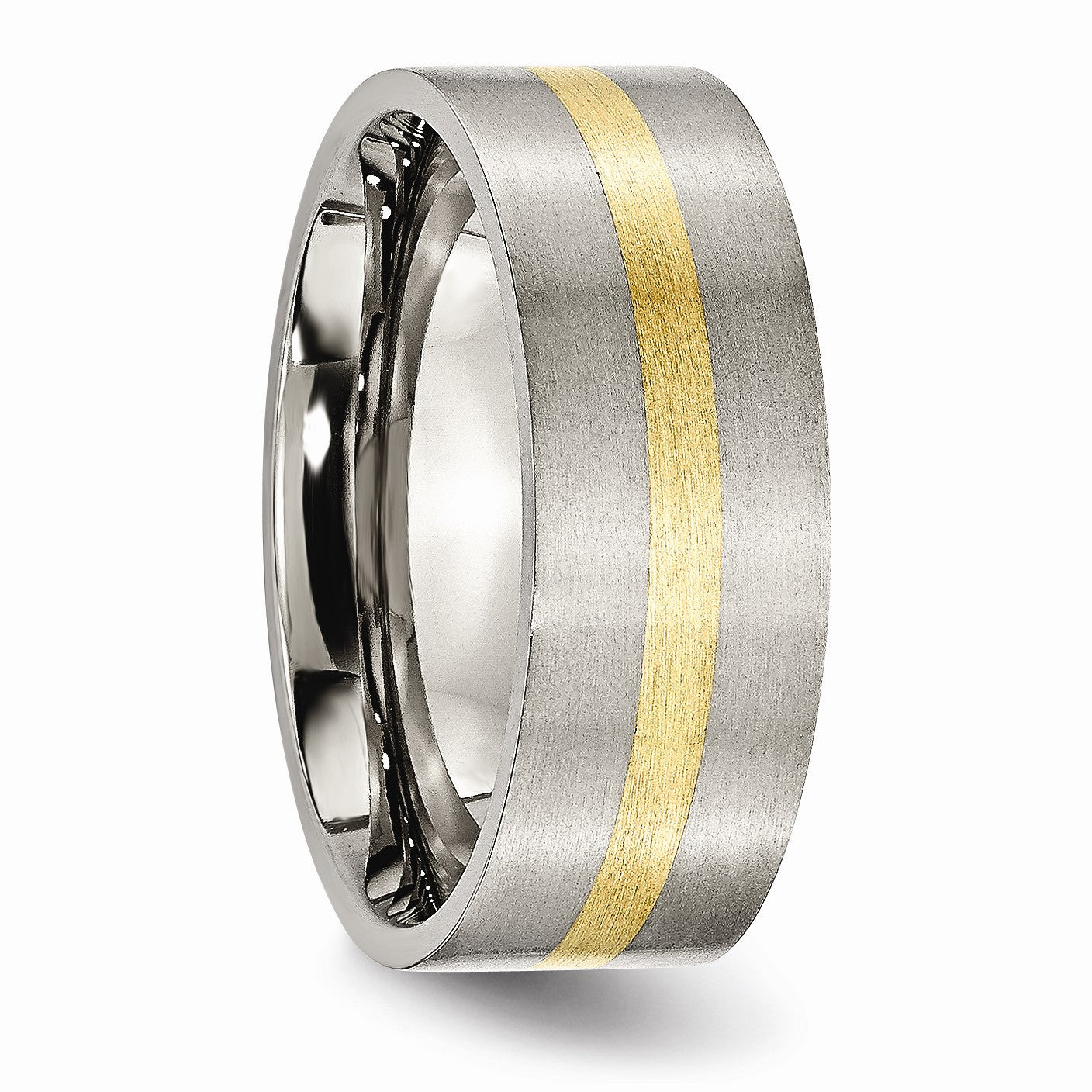 A simple, flat band of titanium combined with a single, 14k gold stripe compliments any outfit. This stunning, unisex ring measures 8mm wide and features a trendy, satin finish and a comfort fit. Because it is also hypoallergenic, it is perfect for everyday wear. Available in whole and half sizes 6-13.
