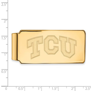 If you are a fan of Texas Christian University and the Horned Frogs then you need to show your school spirit with this Texas Christian University money clip. We are a certified retailer and this authentic item is officially licensed. It is crafted from 14k yellow gold plated sterling silver and crafted in the USA.