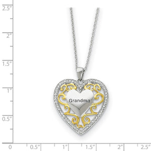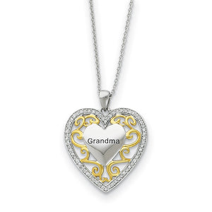 Rhodium & Gold Tone Plated Silver & CZ Grandma Heart Necklace, 18 Inch