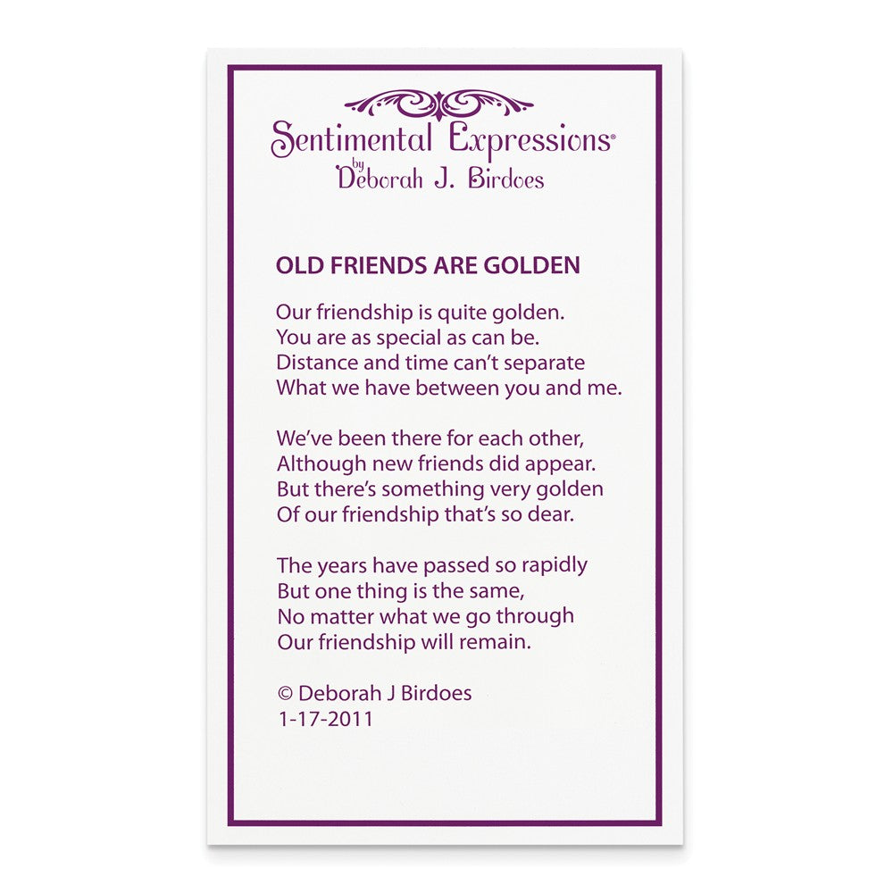Bezel set in the center of this lovely polished rhodium-plated sterling silver pendant is a faceted yellow cubic zirconia stone. It measures approximately 18mm (11/16 inch) in width by 29mm (1-/8 inch) in length, which includes the bail and comes complete on an 18 inch cable chain finished with a spring ring clasp. Each necklace includes a card with the following poem written by the artist printed in English and Spanish. OLD FRIENDS ARE GOLDEN - Our friendship is quite golden. You are as special as can be. Distance and time can't separate what we have between you and me. We've been there for each other, although new friends did appear. But there's something very golden of our friendship that's so dear. The years have passed so rapidly but one thing is the same, no matter what we go through our friendship will remain.