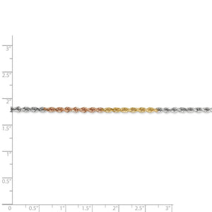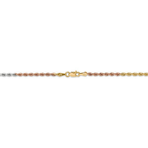 This stunning rope chain handmade from 14k yellow, white and rose gold features a sparkling, diamond-cut design that is finished with a secure, lobster clasp. It measures 2.5mm in width and looks great alone, layered with multiple chains or paired with a gold charm or pendant to complete your desire look. 20 inches in length.