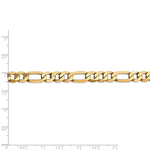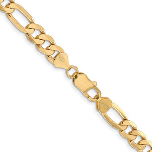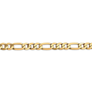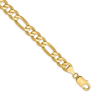 A set of three round links separated by one long oval link creates a sensational repeating pattern on this solid link, flat style figaro design. Measuring 7.5mm in width, this polished 14k yellow gold chain is finished with a classic lobster claw clasp. 9 inches in length.