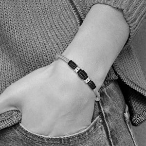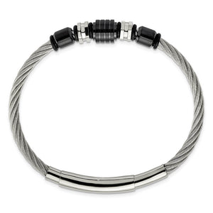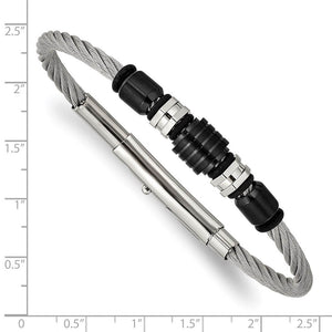 Change up your look with this two-tone stainless steel bracelet featuring brushed, polished and black-plated beads with black rubber spacer and stoppers. The twisted coil band is approximately 4mm (3/16 inch) wide, the top width is approximately 10mm (3/8 inch) and length is adjustable from 8 to 8.75 inches with the push-button clasp.