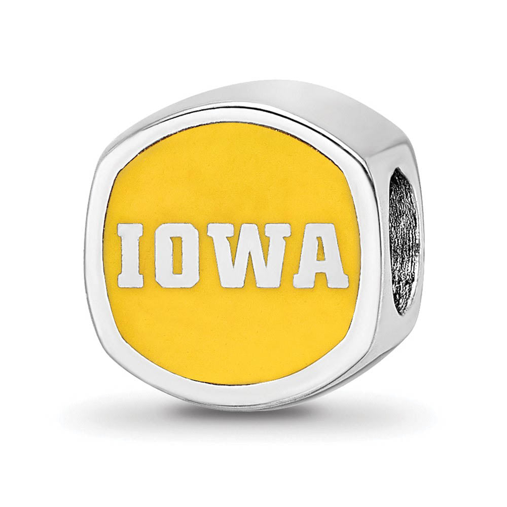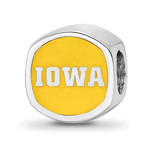 Show your school spirit with this University of Iowa cushion bead charm. It is crafted from rhodium plated sterling silver with yellow enamel and measures approximately 10.9mm in width by 11mm in length. We are a certified retailer and this authentic item is officially licensed. This double sided bead charm is compatible with most major brand, 3mm width, bead style bracelets and necklaces. Enamel colors may vary slightly. The color on your screen may also not reflect actual color due to variations in monitors and browsers. Made in the U.S.A.