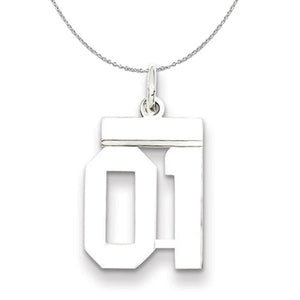 Celebrate your favorite sports player, lucky number or milestone date in your life with a prominent rhodium-plated sterling silver charm. Each polished number is approximately 13mm (1/2 Inch) in length, which is finished with a 2mm top bar and a classic jump ring that will accommodate up to a 3mm chain. Includes a 16 inch, 1.25mm sterling silver chain with a lobster clasp closure.