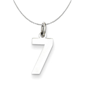 Celebrate your favorite sports player, lucky number or milestone date in your life with a prominent rhodium-plated sterling silver charm. This laser cut polished number is approximately 13mm (1/2 Inch) in length and is finished with a classic jump ring that will accommodate up to a 3mm chain. Includes a 16 inch, 1.25mm sterling silver chain with a lobster clasp closure.