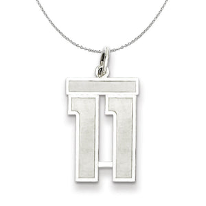Celebrate your favorite sports player, lucky number or milestone date in your life with a prominent rhodium-plated sterling silver charm. Each laser-cut satin and polished number is approximately 15mm (9/16 inch) in length, which is finished with a 3mm top bar and classic jump ring that will accommodate up to a 3mm chain. Includes a 1.25mm, 16 inch sterling silver cable chain.
