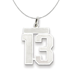 Celebrate your favorite sports player, lucky number or milestone date in your life with a prominent rhodium-plated sterling silver charm. Each laser-cut satin and polished number is approximately 15mm (9/16 inch) in length, which is finished with a 3mm top bar and classic jump ring that will accommodate up to a 3mm chain. Includes a 1.25mm, 16 inch sterling silver cable chain.