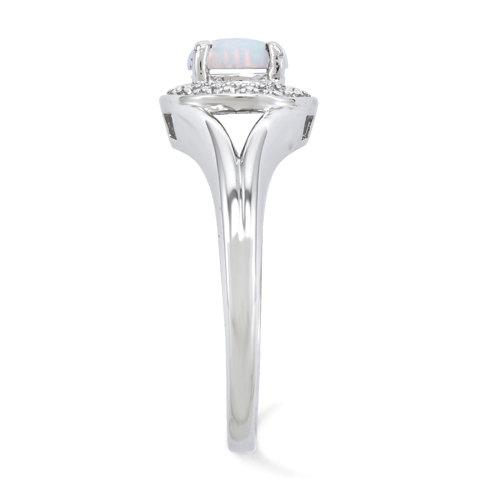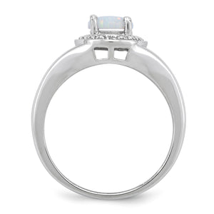 A 6mm created white opal cabochon crowns the center of this diamond accented halo style ring. It is designed from sterling silver with a rhodium plated finish to retain its bright gleaming appearance. Top width is approximately 9mm (3/8 inch). The two natural diamonds are H-I in color, I2-I3 in clarity and the total diamond weight is .1 of a carat.