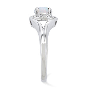 A 6mm created white opal cabochon crowns the center of this diamond accented halo style ring. It is designed from sterling silver with a rhodium plated finish to retain its bright gleaming appearance. Top width is approximately 9mm (3/8 inch). The two natural diamonds are H-I in color, I2-I3 in clarity and the total diamond weight is .1 of a carat. This is a made to order item and is estimated to ship 12/20/2025
