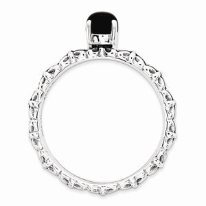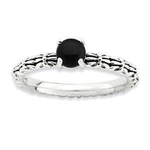 Rich in detail and exotic appeal! Featured atop a 2. Mm antiqued sterling silver band finished with an ornate design is a prong set black agate cabochon. Wear it alone as a solitaire or featured in a stacked collection. Guaranteed to fit together perfectly with all of the mix and match Stackable Expressions rings.