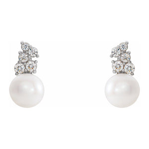 Simply elegant! Each near round white pearl set in these rhodium-plated 14k white gold post earrings range in size from 7.5 to 8mm in diameter and are AA quality (clean; good shape; good luster). Each pair is prong set with five round diamonds that are I1 in clarity and G-H in color. The total diamond weight for the pair is 3/8 of a carat. The approximate length of these earrings is 10mm (3/8 inch). Due to the nature of pearls, colors may not match what is shown (range - white, pinkish or creamy). Pearl treatment: bleached. Diamond treatment: natural, not enhanced. This is a made to order item and is estimated to ship 11/24/2025