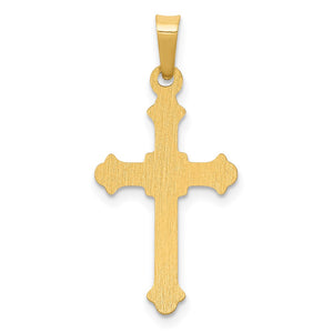 Celebrate and honor all special occasions with jewelry of religious significance! Our collection of spiritually inspired designs that show faith, hope and devotion are perfect for commemorating life's milestones. This fleur de lis cross pendant crafted in 14k yellow gold features a hollow, polished and textured design. The approximate size is 11mm (7/16 inch) in width by 24mm (15/16 inch) in length with the bail. This item does not include a chain.