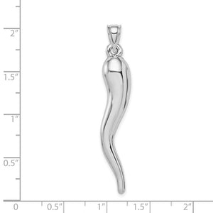 Celebrate and honor all special occasions with jewelry of religious significance! Our collection of spiritually inspired designs that show faith, hope and devotion are perfect for commemorating life's milestones. This large Italian horn pendant crafted in rhodium-plated 14k white gold features a hollow, 3-dimensional, polished design. The approximate size is 8mm (5/16 inch) in width by 48mm (1 13/16 inch) in length with the bail. This item does not include a chain.