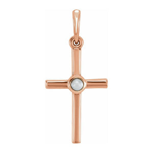 Celebrate and honor all special occasions with jewelry of religious significance! Our collection of spiritually inspired designs that show faith, hope and devotion are perfect for commemorating life's milestones. This small polished cross pendant created in 14k rose gold features a bezel set, half seed, 2mm freshwater cultured white pearl. It is approximately 11mm (7/16 inch) in width by 24mm (15/16 inch) in length with the bail. The chain passage dimensions of the bail are 6 x 3.5mm. This item does not include a chain. This is a made to order item and is estimated to ship in about 12 days. Please email service@theblackbow.com for more details.