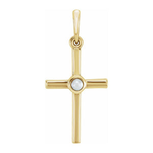 Celebrate and honor all special occasions with jewelry of religious significance! Our collection of spiritually inspired designs that show faith, hope and devotion are perfect for commemorating life's milestones. This small polished cross pendant created in 14k yellow gold features a bezel set, half seed, 2mm freshwater cultured white pearl. It is approximately 11mm (7/16 inch) in width by 24mm (15/16 inch) in length with the bail. The chain passage dimensions of the bail are 6 x 3.5mm. This item does not include a chain.