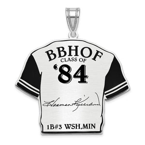 It is time to celebrate your favorite Hall of Fame baseball player, Harmon Killebrew! We are a certified retailer and this authentic signature jersey pendant is officially licensed. It is created from rhodium plated sterling silver with black enamel and is approximately 39mm in width (1 1/2 inches or the size of a silver dollar). Brushed finish. Enamel colors may vary slightly. The color on your screen may also not reflect actual color due to variations in monitors and browsers. Chain not included. Made in the USA