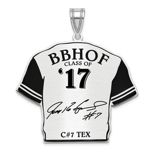 It is time to celebrate your favorite Hall of Fame baseball player, Ivan 'Pudge' Rodriguez! We are a certified retailer and this authentic signature jersey pendant is officially licensed. It is created from rhodium plated sterling silver with black enamel and is approximately 39mm in width (1 1/2 inches or the size of a silver dollar). Brushed finish. Enamel colors may vary slightly. The color on your screen may also not reflect actual color due to variations in monitors and browsers. Chain not included. Made in the USA This item is not currently in-stock. Once you place your order, please allow us 5 to 7 business days to make it for you.