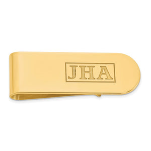 There's nothing more personal than a money clip with your initials on it. This personalized polished and laser-cut fold over money clip is crafted in 14k yellow gold-plated sterling silver and customized with up to 3 recessed upper-case letters to make this piece truly one of a kind. It is approximately 17 mm (5/8 inch) in width, 52mm (2 inches) in length and 0.89mm (35 gauge) in thickness. A slightly thicker option (1.27mm or 50 gauge) is available by special order; please email us for specific details and pricing. Please note personalized items are non-returnable. Made in the U.S.A. This is a made to order item and is estimated to ship in about 10 days. Please email service@theblackbow.com for more details.