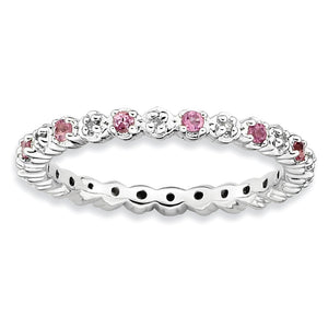 Pink Tourmaline, October's birthstone symbolizes emotional and spiritual love giving the feeling of comfort and safety. Diamonds of course are said to be a girl's best friend. This 2.5mm wide band fashioned from rhodium plated sterling silver is prong set with alternating gemstones all the way around. Guaranteed to fit together perfectly with all of the mix and match Stackable Expressions rings. The color range varies on all natural stones so please allow for slight variations in shades.