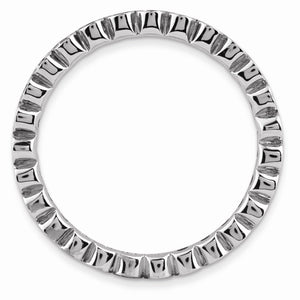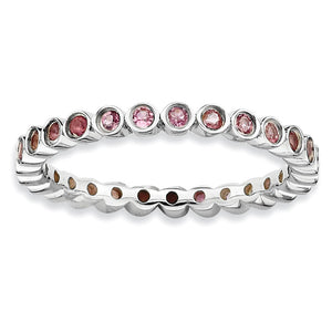 Pink Tourmaline, October's birthstone symbolizes emotional and spiritual love giving the feeling of comfort and safety. This 2.5mm wide band fashioned from rhodium plated sterling silver is bezel set with 1. Mm round faceted natural gemstones all the way around. The color range varies on natural gemstones so please allow for slight variations in shades. Guaranteed to fit together perfectly with all of the mix and match Stackable Expressions rings.