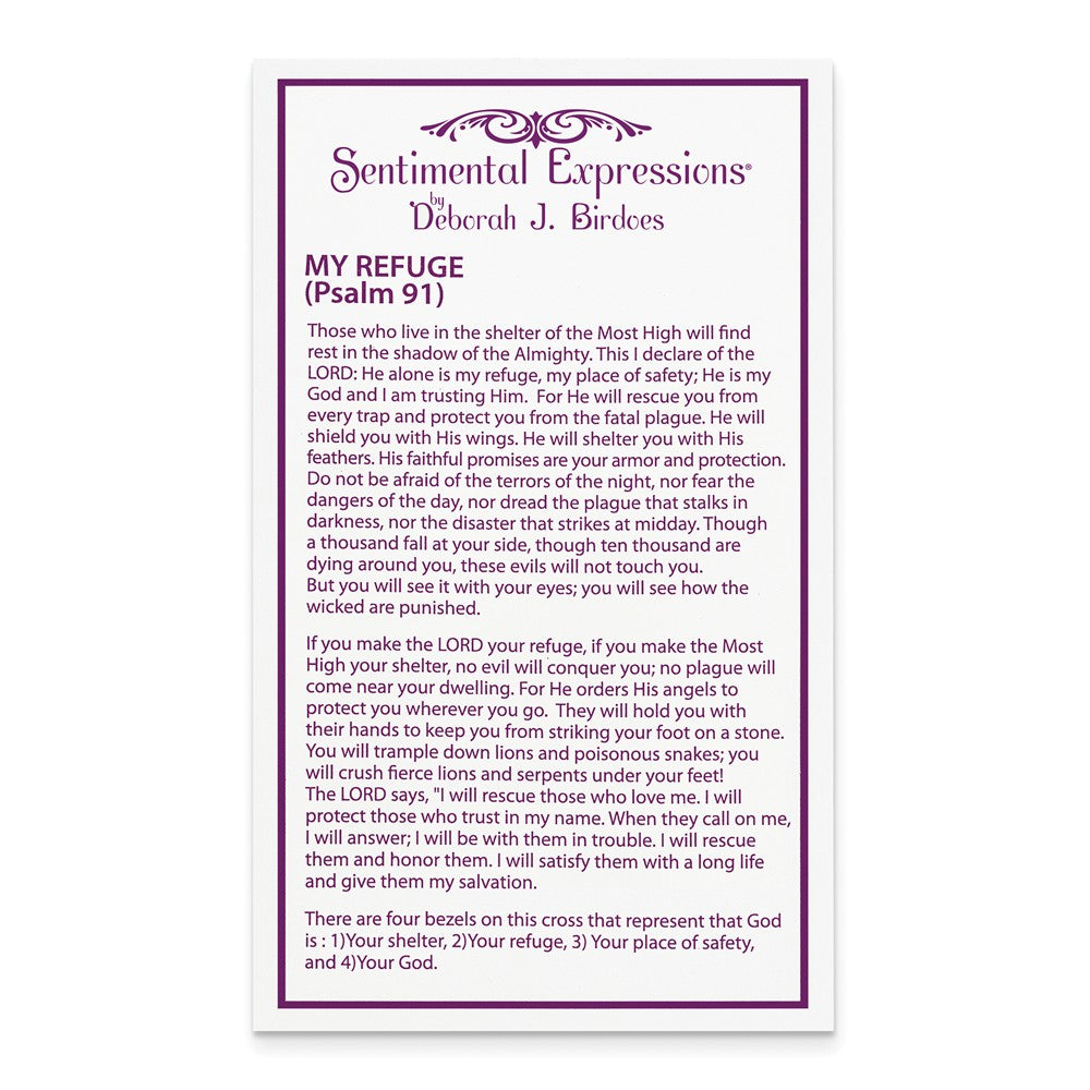 This elegant cross necklace is crafted from rhodium-plated sterling silver, black enamel and cubic zirconia gemstones. The pendant is approximately 30mm (1 3/16 inch) in width by 49mm (1 7/8 inch) in length with the bail. The cable chain is 18-inches long and closes with a spring ring clasp. Each cross includes the following message and verse card printed in English and Spanish. There are four bezels on this cross that represent that God is: your shelter, your refuge, your place of safety and your God. Verse: Psalm 91