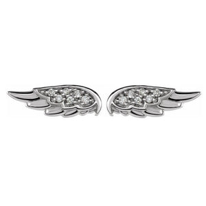 • Tie the meaning to the moment with a classic or unusual pair of earrings that makes it personal, thoughtful, or meaningful. These dainty wing post earrings created in rhodium-plated 14k white gold features 12 genuine diamonds that are I1 in clarity and G-H color. Total diamond weight for the pair is .03 of a carat. The approximate size of each wing is 4mm in width by 11mm (7/16 inch) in length.