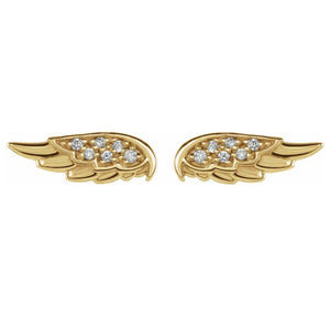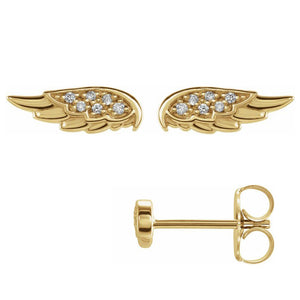 • Tie the meaning to the moment with a classic or unusual pair of earrings that makes it personal, thoughtful, or meaningful. These dainty wing post earrings created in 14k yellow gold features 12 genuine diamonds that are I1 in clarity and G-H color. Total diamond weight for the pair is .03 of a carat. The approximate size of each wing is 4mm in width by 11mm (7/16 inch) in length. This is a made to order item and is estimated to ship 11/24/2025
