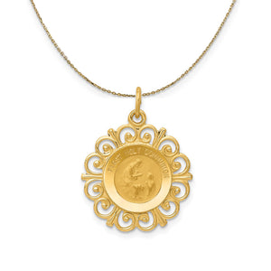 Holy Communion, the celebration of the Eucharist. Crafted from 14 karat yellow gold with a polished and satin finish. Charm measures 3/4 Inch in diameter and is suitable for engraving. Includes a 18 inch long, 0.9mm wide, solid 14k yellow gold cable chain with a spring ring clasp.