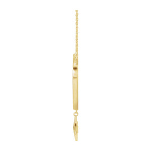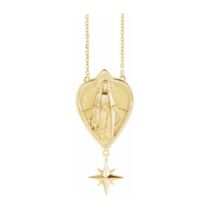 Faith inspired fashion, this Miraculous Mary necklace created from 14k yellow gold is 16-inches in length. The pendant is approximately 16mm (5/8 inch) in width by 24mm (15/16 Inch) in length. The solid cable chain has a diamond-cut finish, closes with a spring ring clasp and is 1mm in width. This is a made to order item and is estimated to ship 11/24/2025