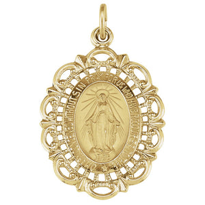 Celebrate and honor all special occasions with jewelry of religious significance! Our collection of spiritually inspired designs that show faith, hope and devotion are perfect for commemorating life's milestones. This Miraculous Medal pendant crafted in polished 14k yellow gold features an oval shape with a textured filigree design. The approximate size is 16mm (5/8 inch) in width by 25mm (1 inch) in length. This item does not include a chain.