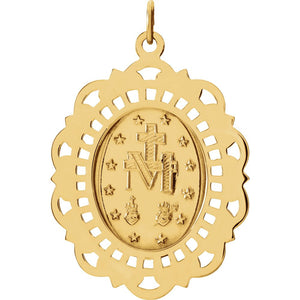 Celebrate and honor all special occasions with jewelry of religious significance! Our collection of spiritually inspired designs that show faith, hope and devotion are perfect for commemorating life's milestones. This Miraculous Medal pendant crafted in polished 14k yellow gold features an oval shape with a textured filigree design. The approximate size is 18mm (11/16 inch) in width by 28mm (1 1/8 inch) in length. This item does not include a chain.