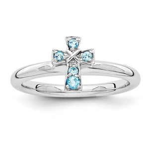 Customize a look that reflects your own unique style with a gemstone cross ring designed to celebrate your devout faith! This polished ring fashioned from tarnish resistant rhodium plated sterling silver features a 8 x 9mm cross prong set with a genuine blue topaz stones and a 2.5mm width band. The irradiated gemstones are 1. Mm to 2mm in size and the total gemstone weight is 1/10 carat. The color range varies on natural gemstones so please allow for slight variations in shades. Wear it alone or in meaningful combinations, guaranteed to fit together perfectly with all of the mix and match Stackable Expressions rings.