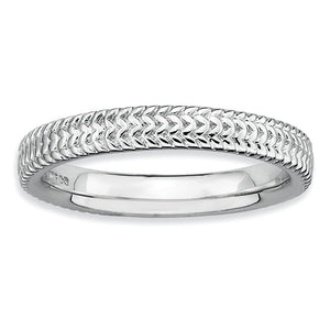 Make it simple and stylish with bands of different textures, finished, widths and colors! This rhodium plated sterling silver band features a textured design with a high polished finish that measures 3.5mm wide. Guaranteed to fit together perfectly with all of the mix and match Stackable Expressions rings.