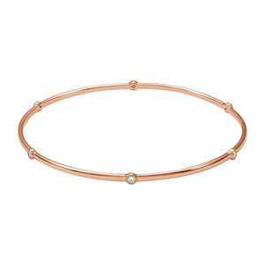 A timeless classic design fashioned from 14k rose gold featuring 6 bezel set, I1 clarity, H-I white diamonds totaling a 1/4 carat. This slip-on style bangle is approximately 2.5mm (1/8 inch) in width by 8 inches in circumference.