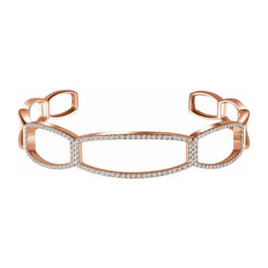 • Classic elegance is always in fashion and never ages! This stunning cuff bracelet created in 14k rose gold is prong set with 134 genuine diamonds totaling 3/4 carat. The natural diamonds are I1 in clarity and G-H in color. It is approximately 11.75mm (7/16 inch) in width by 6.25-inches in circumference.
