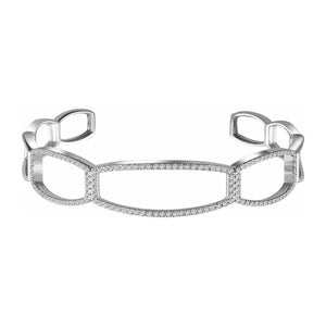 • Classic elegance is always in fashion and never ages! This stunning cuff bracelet created in rhodium-plated 14k white gold is prong set with 134 genuine diamonds totaling 3/4 carat. The natural diamonds are I1 in clarity and G-H in color. It is approximately 11.75mm (7/16 inch) in width by 6.25-inches in circumference.